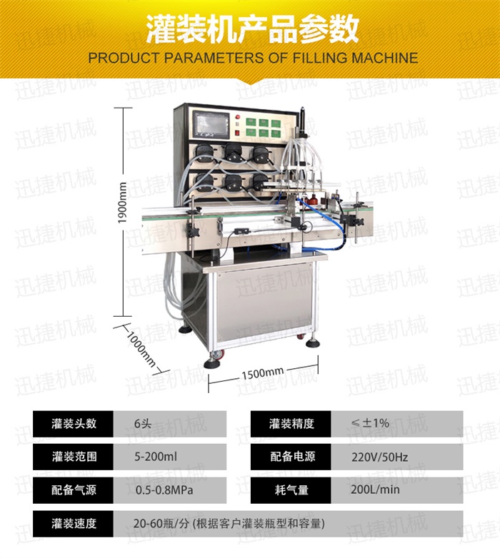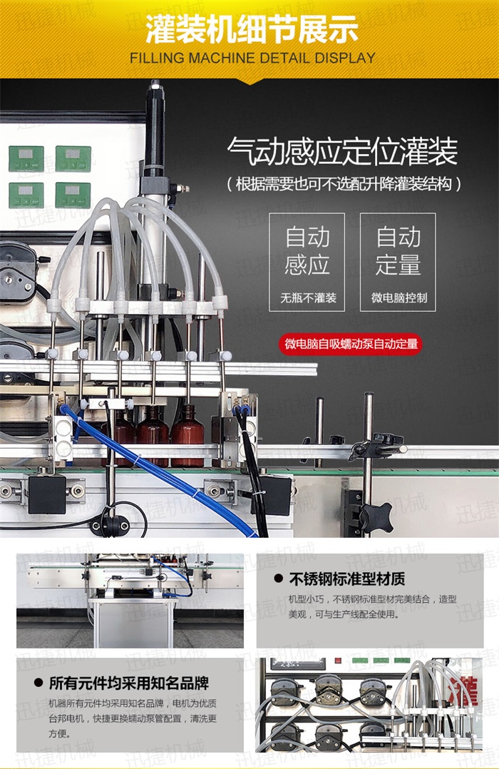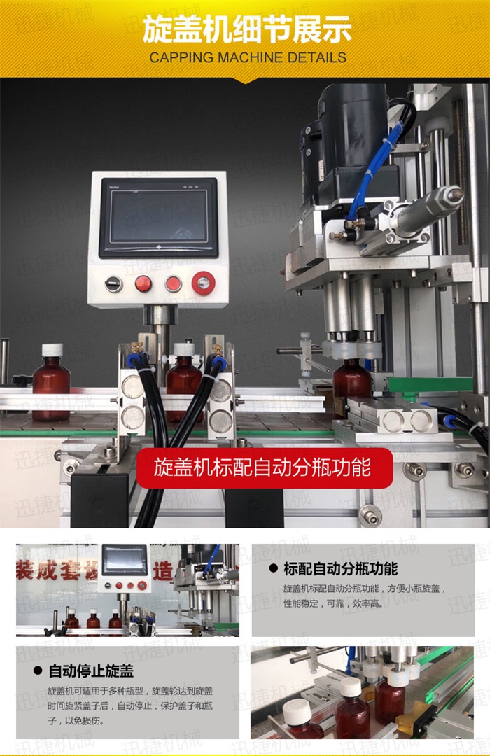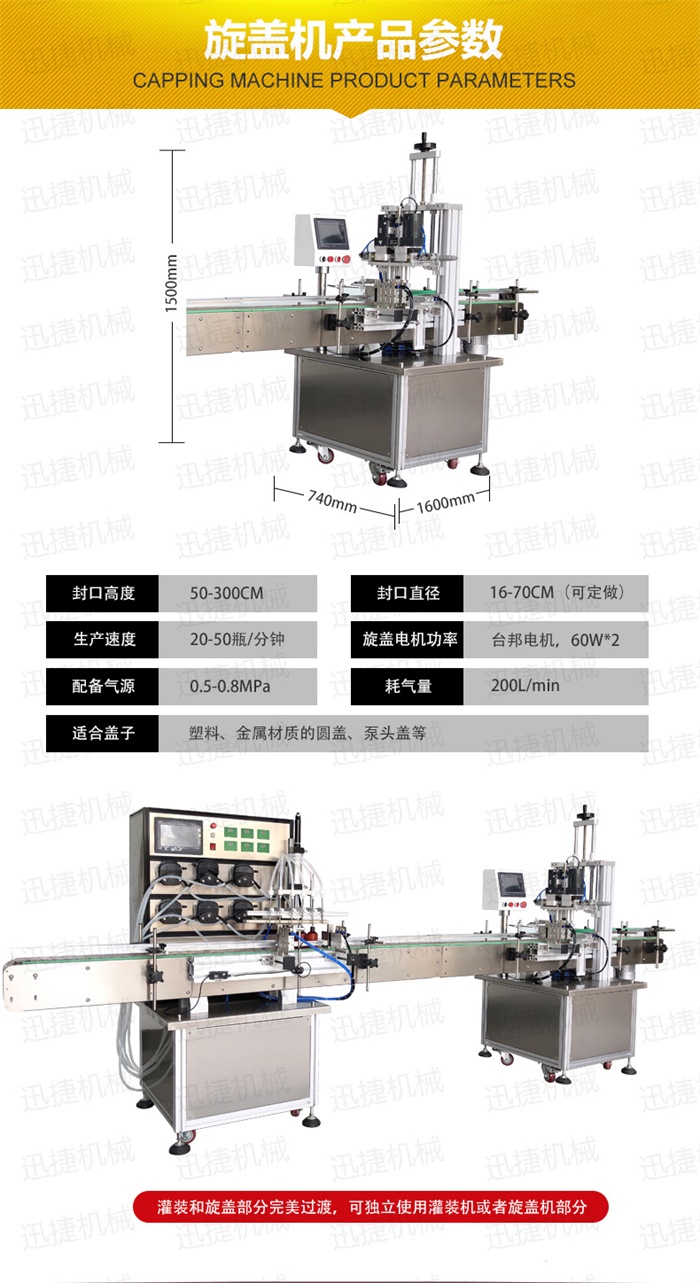 特 点:定量灌装,和瓶盖旋盖,在一台机器上完成。具有占地空间小,自动化程度高特点