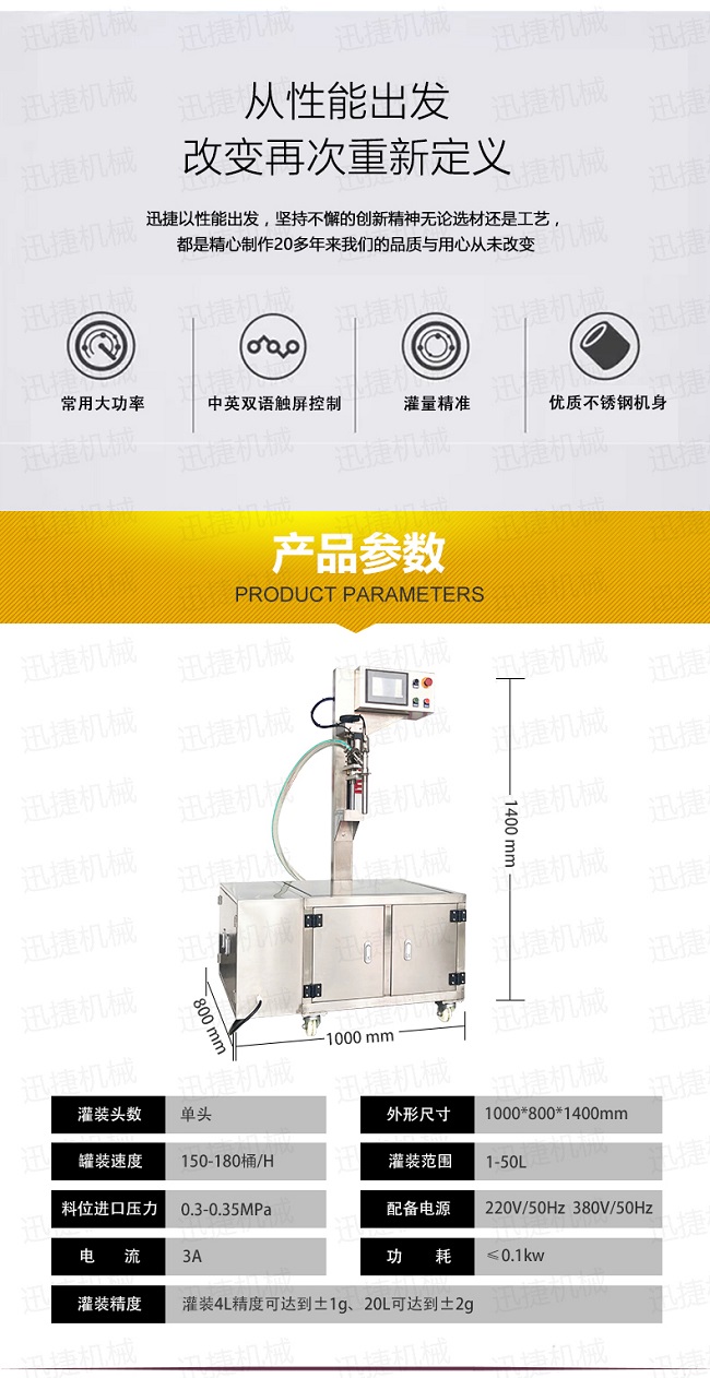 1.罐装范围广,本机可罐装1-50L。可满足多种规格得罐装。