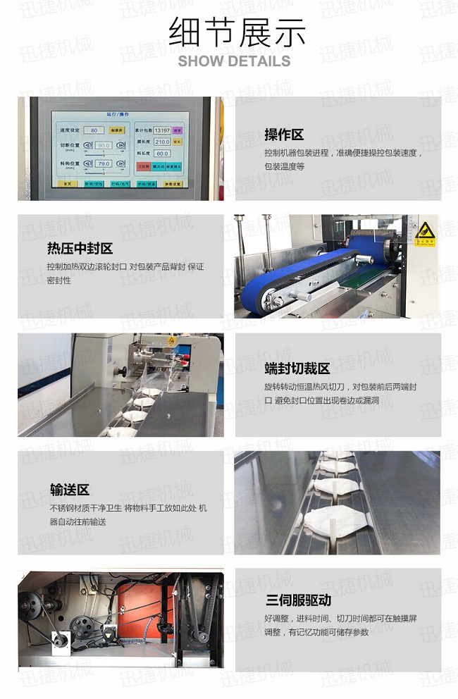 一次性口罩包装设备口罩包装机可用于饼干、月饼、蛋黄派、米饼、雪糕、方便面、巧克力等块状产品的包装,特别适合于小批量单一产品的包装。