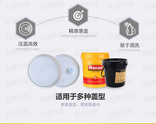 人工放盖至料仓——自动剥离——自动吸盖——自动挂盖——自动滚压盖——自动出桶——一个循环完成。