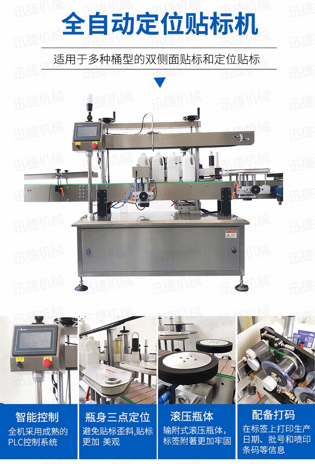 全机采用微电脑-PLC-电子光纤传感器控制系统,使整机运行稳定、高速操作系统采用操作界面控制,操作简便、实用、效率高,并有产量记数功的速度快且稳定适用范围大,可用于各种尺寸的圆形瓶贴标输附式滚压瓶体,使标签附著更加牢固前后段可选连线使用。
