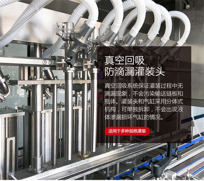 1.真空回吸系统保证灌装过程中无滴漏现象,不会污染输送链板和瓶体。灌装头和气缸采用分体式机构,可单独拆卸,不会出现液体渗漏损坏气缸的情况。进口亚德客气缸经久耐用,其他密封等配件使用标准件,更换维护简单方便。