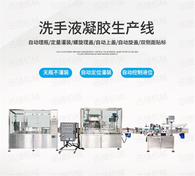 全自动凝胶生产线适用于消毒凝胶、免洗手洗手液、免洗手消毒凝胶、消毒液、84消毒液、医用酒精、75%酒精消毒液、75度酒精、消毒水、杀菌消毒剂、医用酒精、碘酒、次氯酸钠、剂、医用乙醇消毒液、瓶装消毒剂等产品,有多头全自动消毒液灌装机和封箱机、贴标机、打包机、喷码机等配套设备组成,实现消毒液自动灌装,自动旋盖,自动贴标,从灌装、到成品的全部过程