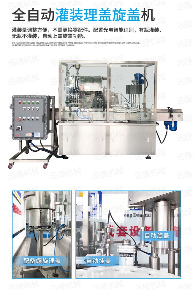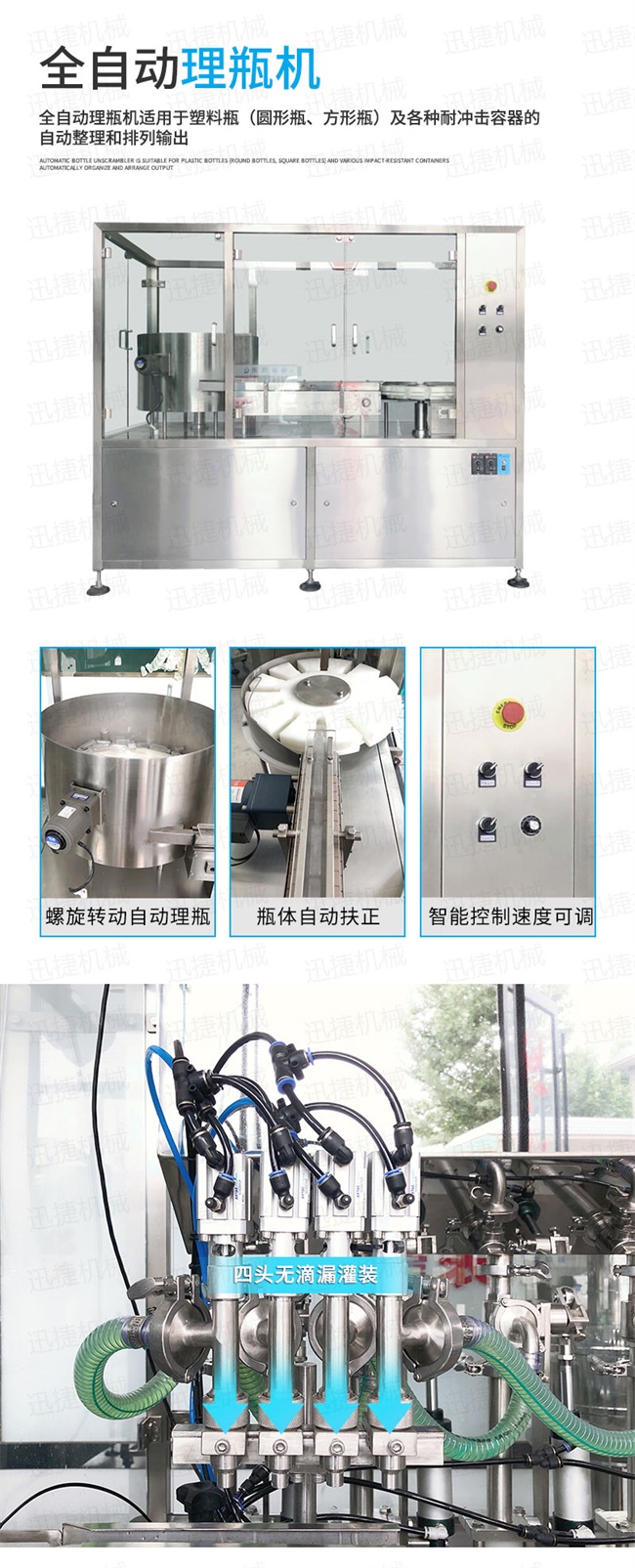 1.自动理瓶、灌装、压盖、旋盖、贴标。