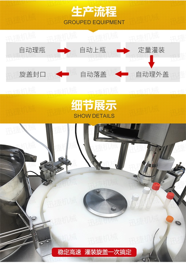 本机是在引进和吸收国外技术的基础上,由我公司自主研发的一款IVD诊断试剂灌装旋盖一体机,能同时完成自动理瓶、自动上瓶、定量灌装、自动理盖、上盖和旋盖封口等动作。本机采用日本高精度封闭式凸轮分度工位器,精度高,运行可靠,使用寿命长。该分度器结构简单,长期使用无需维修。该型号设备主要用于ⅣD体外诊断试剂制药、生物制药行业及科研领域装。机器设计紧凑合理、外形简洁美观,灌装量调节方便。