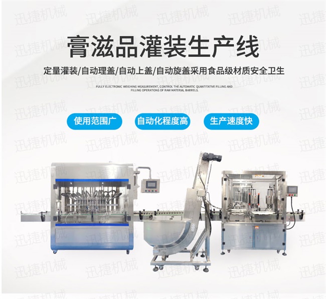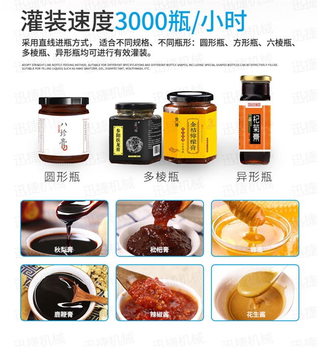 枇杷膏自动灌装机生产流水线适用于各种1、各种膏滋如:秋梨膏、枇杷膏、鹿鞭膏、蜂蜜等的灌装。2、调味酱如:香菇酱、辣椒酱、豆瓣酱、花生酱、芝麻酱、牛油火锅底料、红油火锅底料。3、采用多规格的灌装转阀、灌装头,可适应不同客户物料的灌装需求。