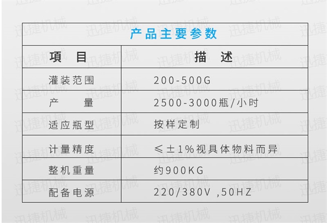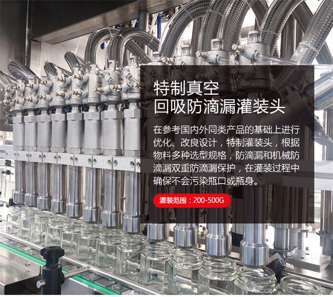 3、灌装机采用横推料的方式,大大缩短了下料斗到灌装头的距离,提高了灌装速度,更重要的是解决了含油量大的物料在灌装过程中出现的有些瓶油多,有些瓶酱多的灌装难题,大大提高了灌装精度。