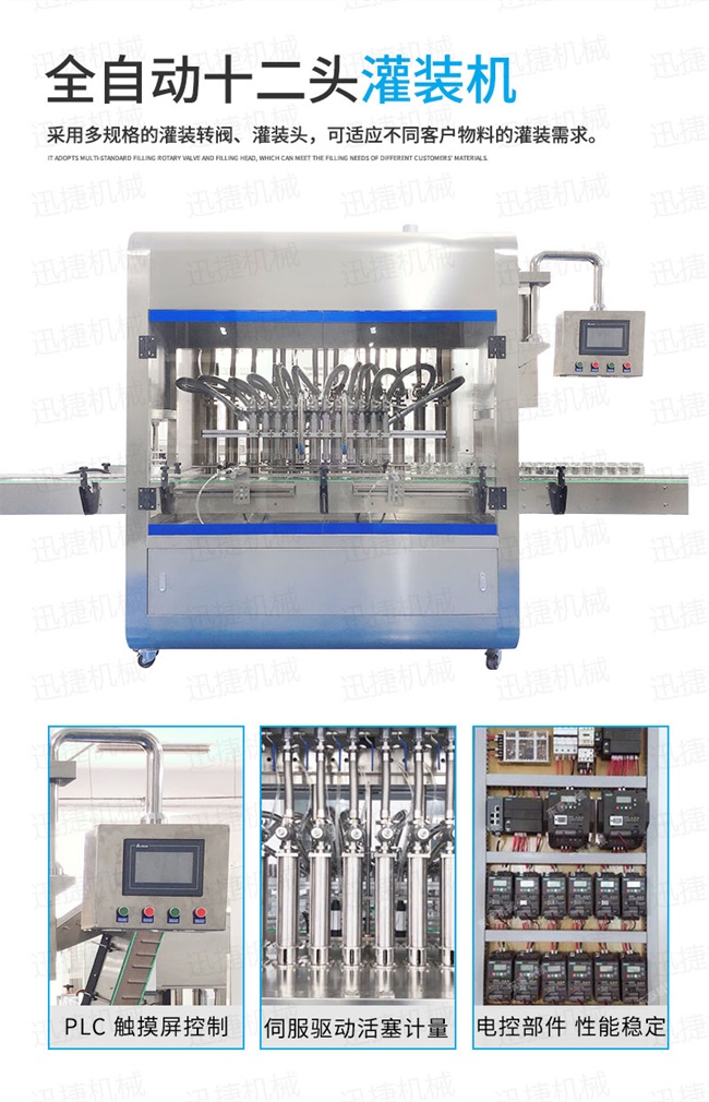 2、灌装机以进口PLC电脑控制、伺服驱动计量,全彩色触摸屏人机界面,一键完成计量切换确保容量之调整简易、快捷、准确。是任何形式的灌装机无法替代的;