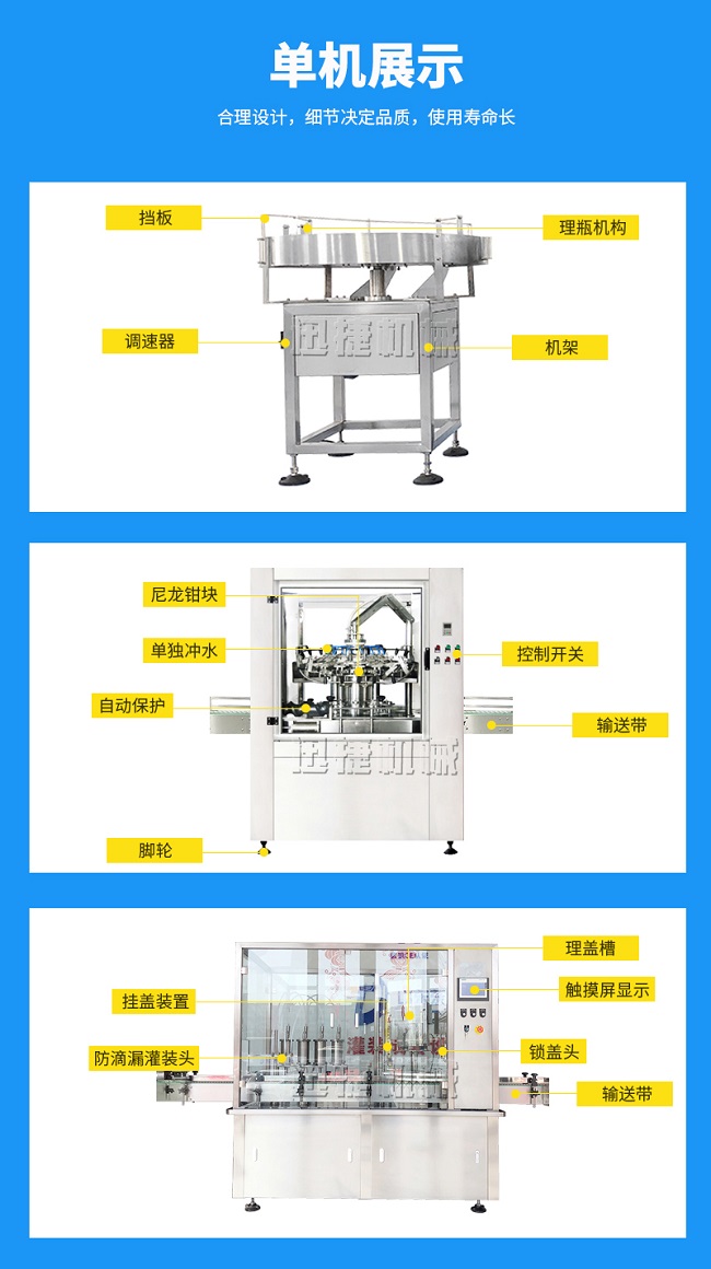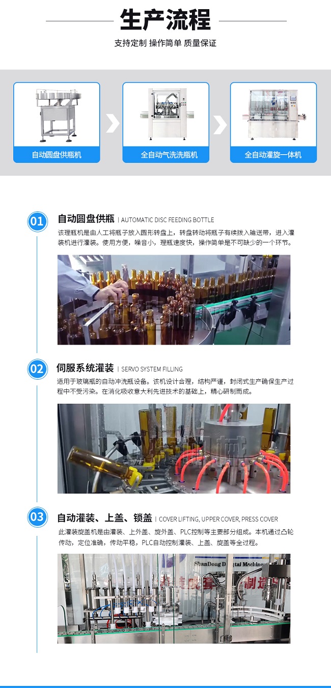 本灌装流水线设备具有稳定可靠、自动化水平高,相比同类产品有着更长的使用年限,维护简单,整线中各设备的协调性、连贯性强,整线设计合理等特点。灌装设备采用系统结构,为当今行业内水平,整线满足量产化、集成化生产的需要。