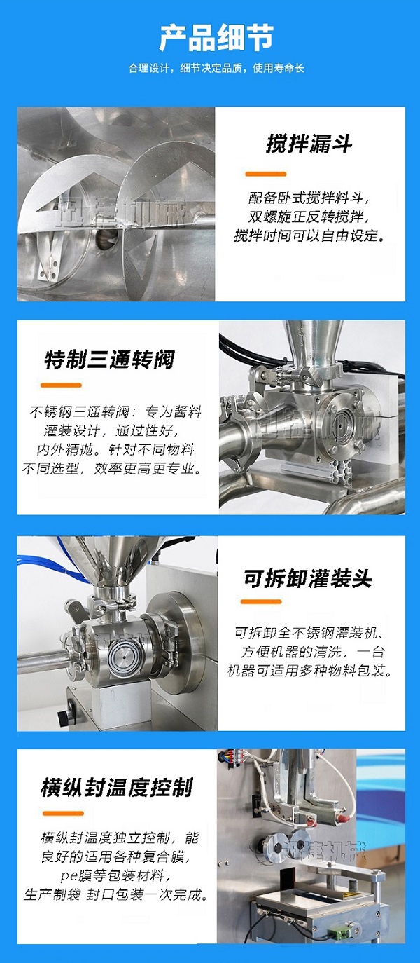 该包装机适用于包装芝麻酱、食用油、洗发液、调味汁、油脂、脂膏、化妆品等产品,将其灌入袋内,能适合各种粘度的产品。该机具有快速、精确、经济和实用的优点。双系统设置,可实现酱与油的分流包装。