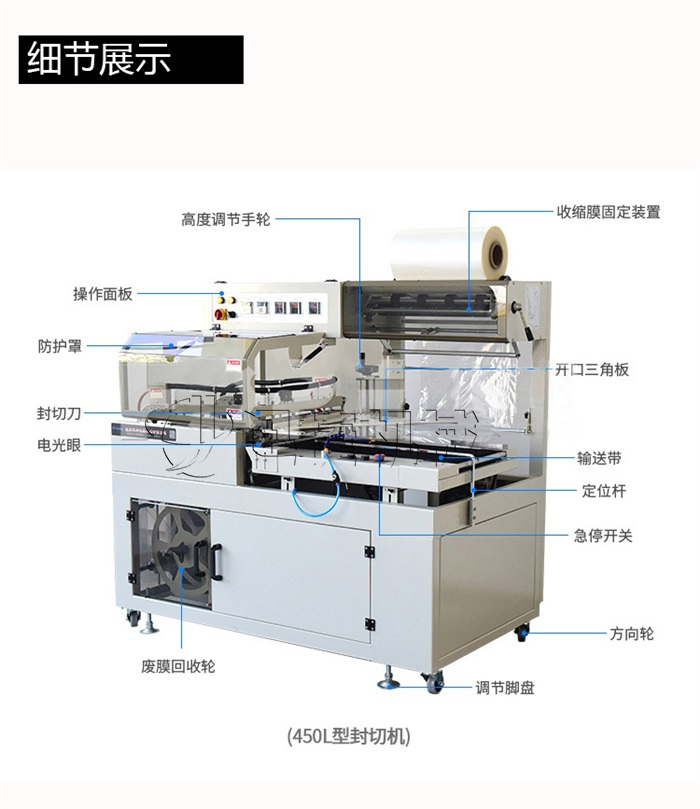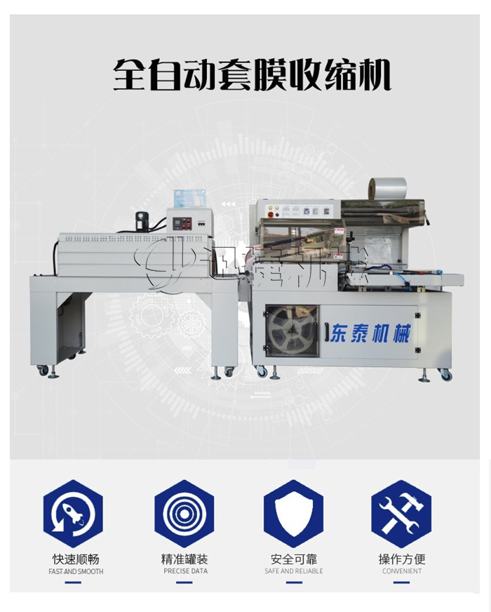 全自动套膜收缩机是由全自动450L封切机和热收缩机组成,入袋、切断、热封、热收缩一条线自动完成,还可以与进料生产线连接,实现无人操作。提高效率,带来利益。全自动化封切收割,适用于各种物品的套膜及收缩,生产效率高。