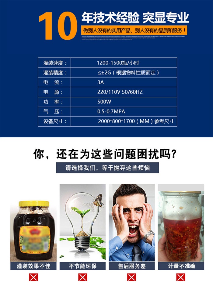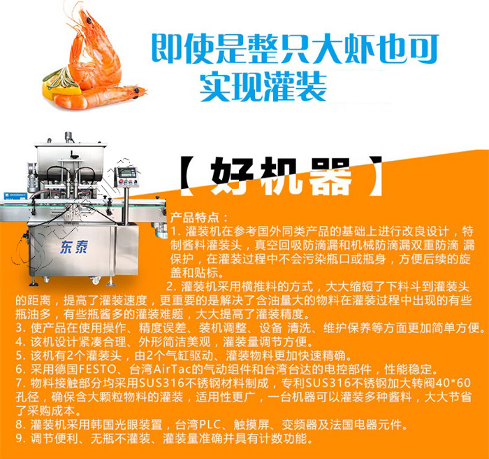 该系列灌装机采用活塞式气缸气动原理,适用于调味品中带颗粒并且浓度较大的香菇酱、辣椒酱、豆瓣酱、花生酱、芝麻酱、果酱、牛油火锅底料、红油火锅底料等较为粘稠酱类的灌装。灌装转阀可以很具客户物料定做加大,以适应不同客户物料的灌装需求。