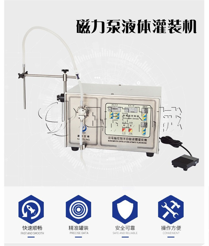 磁力泵液体灌装机又名半自动液体灌装机,双头液体灌装机等,自身采用自吸式泵及泵转速和泵的工作时间来测定灌装量的新型液体灌装机。磁力泵液体灌装机广泛适用于化妆品、医药、农药、化工产品等无腐蚀性液体的灌装。磁力泵液体灌装机结构简单,操作方便。并可将出料嘴加长,皮管任意移动灌装,能满足5ml以上无限量(任意可调)灌装容量要求,并不受灌装容量的限制,是一种可靠耐用的磁力泵液体灌装机。