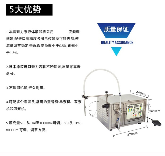 A、磁力泵液体灌装机采用世界工厂变频调速器,配进口高精度多圈电位器及可锁表盘,使流量调节稳定准确,误差负偏小于0.5%,正偏小于1.5%;
