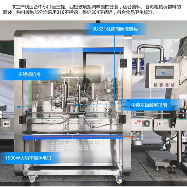 有句话是这样说的,精打细造出精品,东泰自动浓酱灌装机的出现,满足了企业的需求,有的企业的酱类灌装机浓稠度较高,灌装起来相对的比较困难,这款自动浓酱灌装机解决了油酱分离的问题,这款自动浓酱灌装机适用于各种含颗粒的半流体、膏体、酱料的灌装,也可灌装各种粘稠体等。对于企业来说节省了开支,为企业带来了更大的效益。