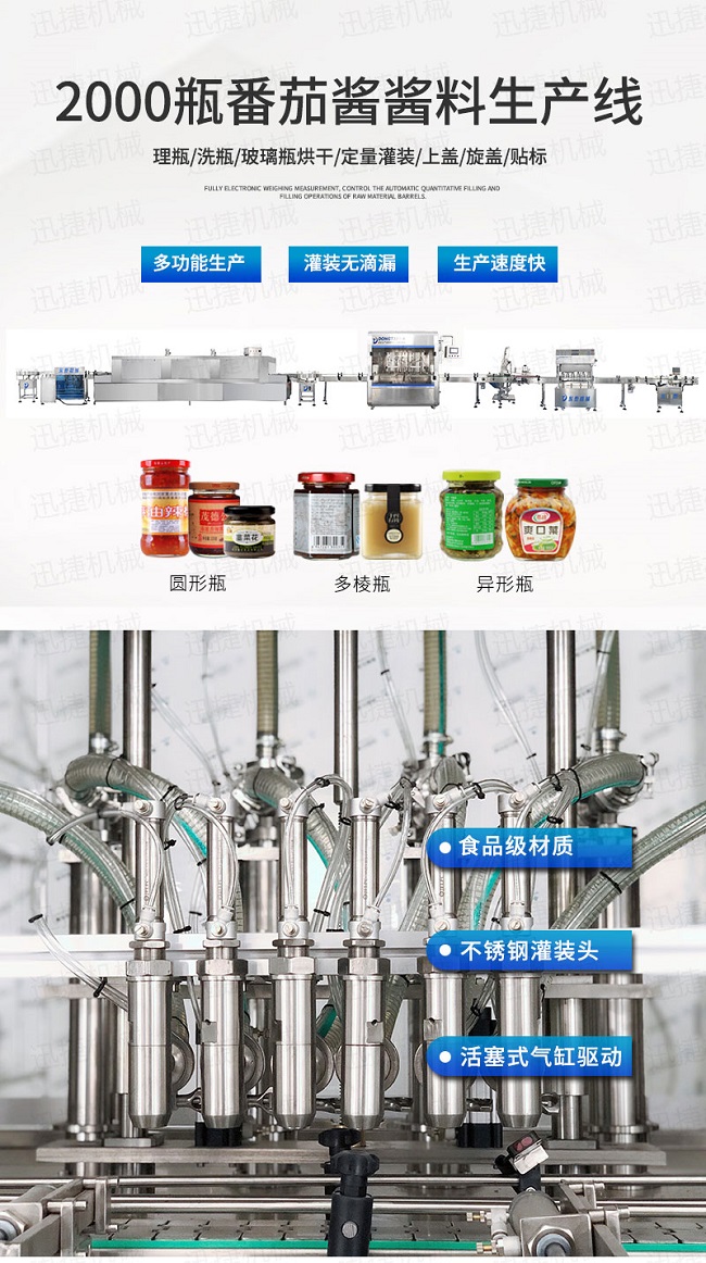 功能齐全,能够针对不同的产品进行有区别灌装的番茄酱灌装机备316L不锈钢精制防滴漏灌装头,专为番茄酱的灌装去设计的,通过性好,内外精抛,促进酱料工业的进步,而酱料工业的发展又来作用于番茄酱灌装机的更新换代技术进步,雄厚的经济技术实力助力与企业在市场中不断的升温不断进行技术的融合让番茄酱灌装机设备在外观、材质上有着更加美观的特点,在这个科技发展的年代,您还有什么理由不去选择使用番茄酱灌装机来保护自己的产品呢?