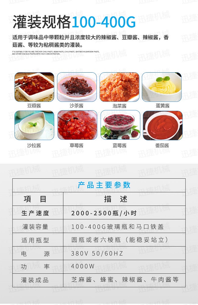 灌装机采用活塞式灌装原理,适用于调味品中带颗粒并且浓度较大的辣椒酱、豆瓣酱、花生酱、香菇酱、果酱、牛油火锅底料、红油火锅底料、虾酱等较为粘稠酱类的灌装。