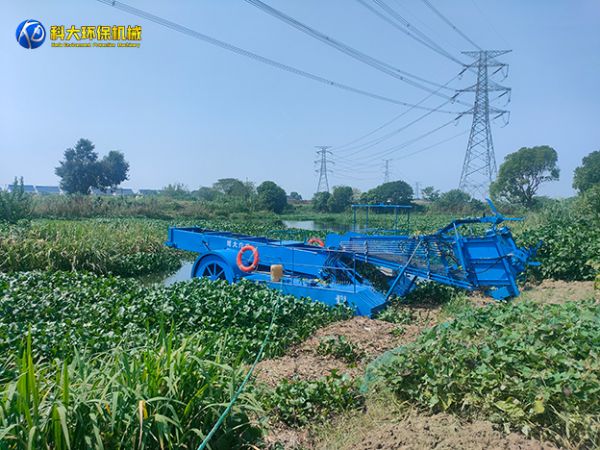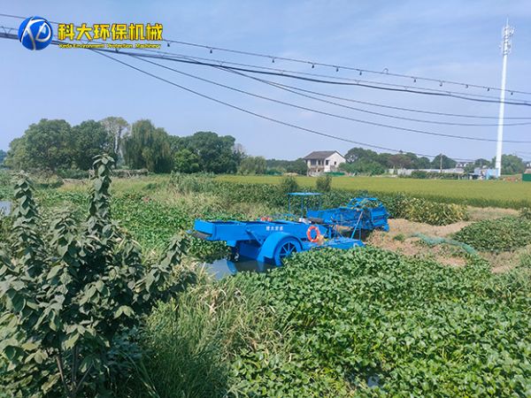 小型全自動水葫蘆打撈船在江蘇順利下水,該船用于收割打撈水面水生植物。