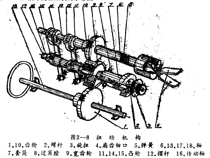 搪块经裹包后,两端要扭结封闭。该机构由左右两部分组成,图示为左端部分。