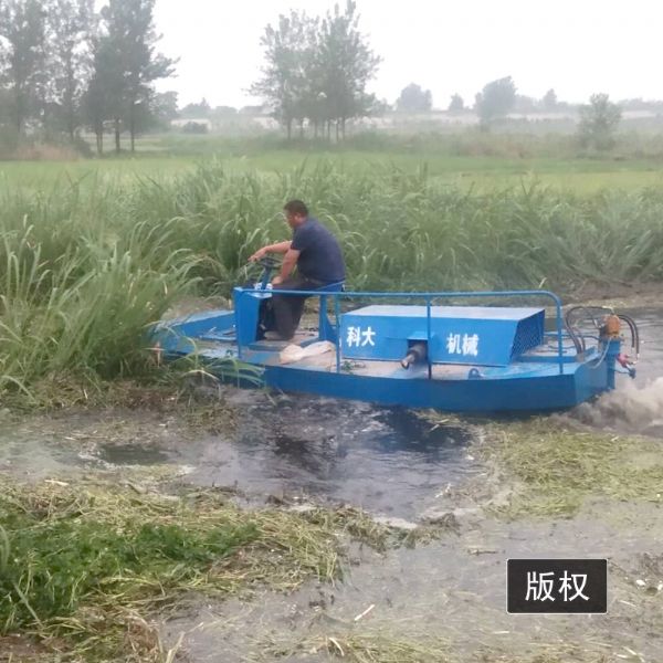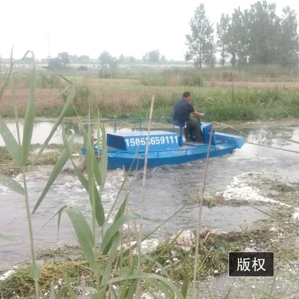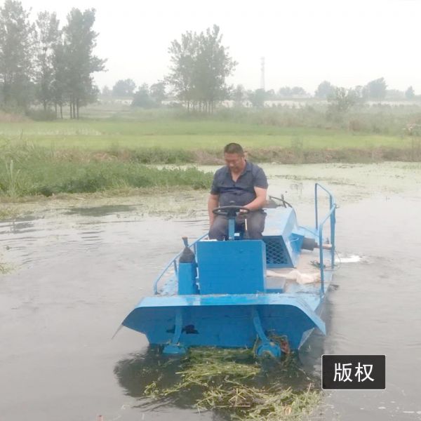碎草船由船體,動力源、方向器、主傳動軸及其支承軸承、螺旋槳及碎草傳動離合器、螺旋槳、船舵、碎草輪架、碎草輪軸及其支承軸承、碎草輪、側向及中間別開草器、擋板、主動及被動傘形齒輪等連接組成。船在前進時,碎草輪上的碎草齒與碎草輪架上的互碎齒互相咬合著將溝渠湖泊水面上的雜草雜物碰打咬碎,使之沉入水中或隨水泵排出,從而充分發揮提水泵的效率,保障受漬或受旱農作物的及時排水供水。其結構簡單,操作使用方便。